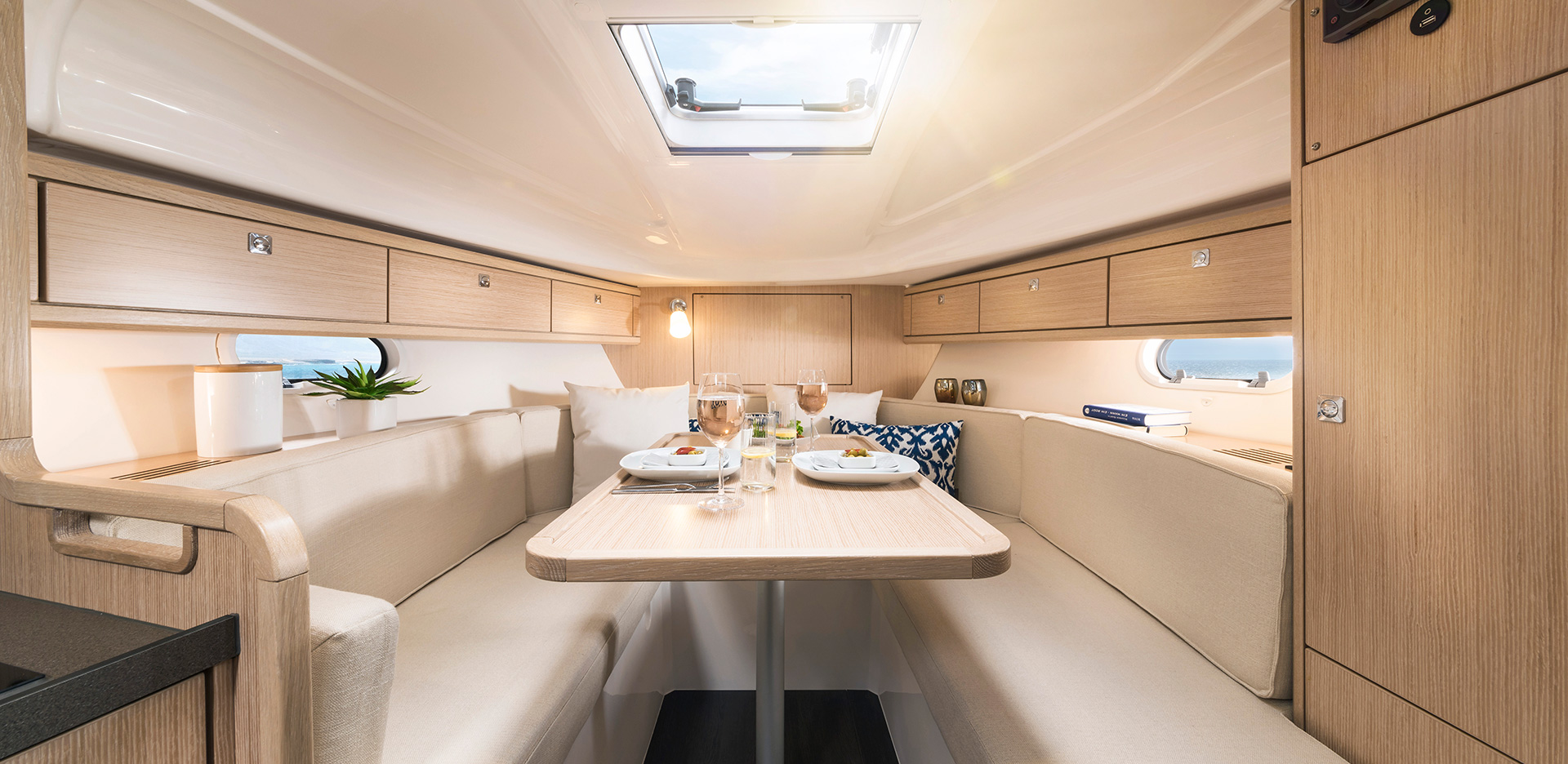 Debajo de la cubierta de la BAVARIA S29 es simplemente el mejor lugar para terminar un buen día en el mar. Arrojar una comida para cuatro personas es una alegría en la cocina. Y si sus huéspedes quieren quedarse más tiempo, no hay problema – la mesa de salón se puede bajar y la zona transformada en una cómoda cama doble. La atención al detalle que es tan típico de BAVIERA es también evidente aquí.