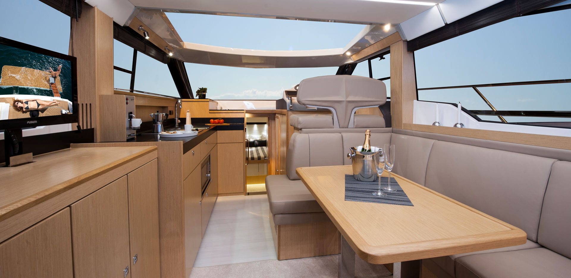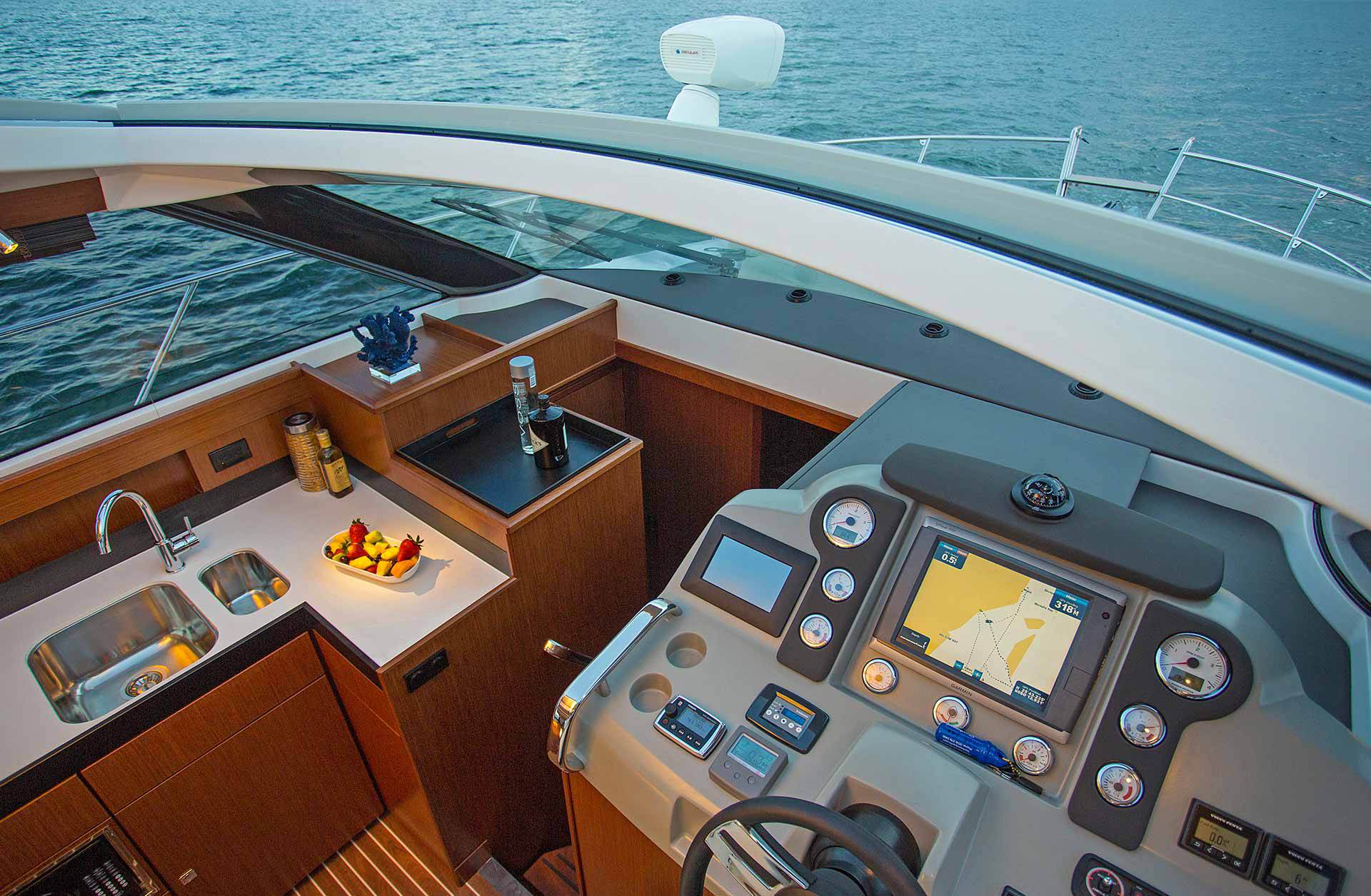 Un ingenioso concepto de iluminación crea un toque único de vida en todos los espacios a bordo del VIRTESS 420 COUPE. La gran puerta corredera a la cabina no sólo permite una vista perfecta de 360 grados de toda la VIRTESS 420 COUPE, sino que también combina la cabina y el gran salón para formar una unidad. Al igual que el VIRTESS 420 FLY, el VIRTESS 420 COUPE tiene tres camarotes y un espacioso salón.